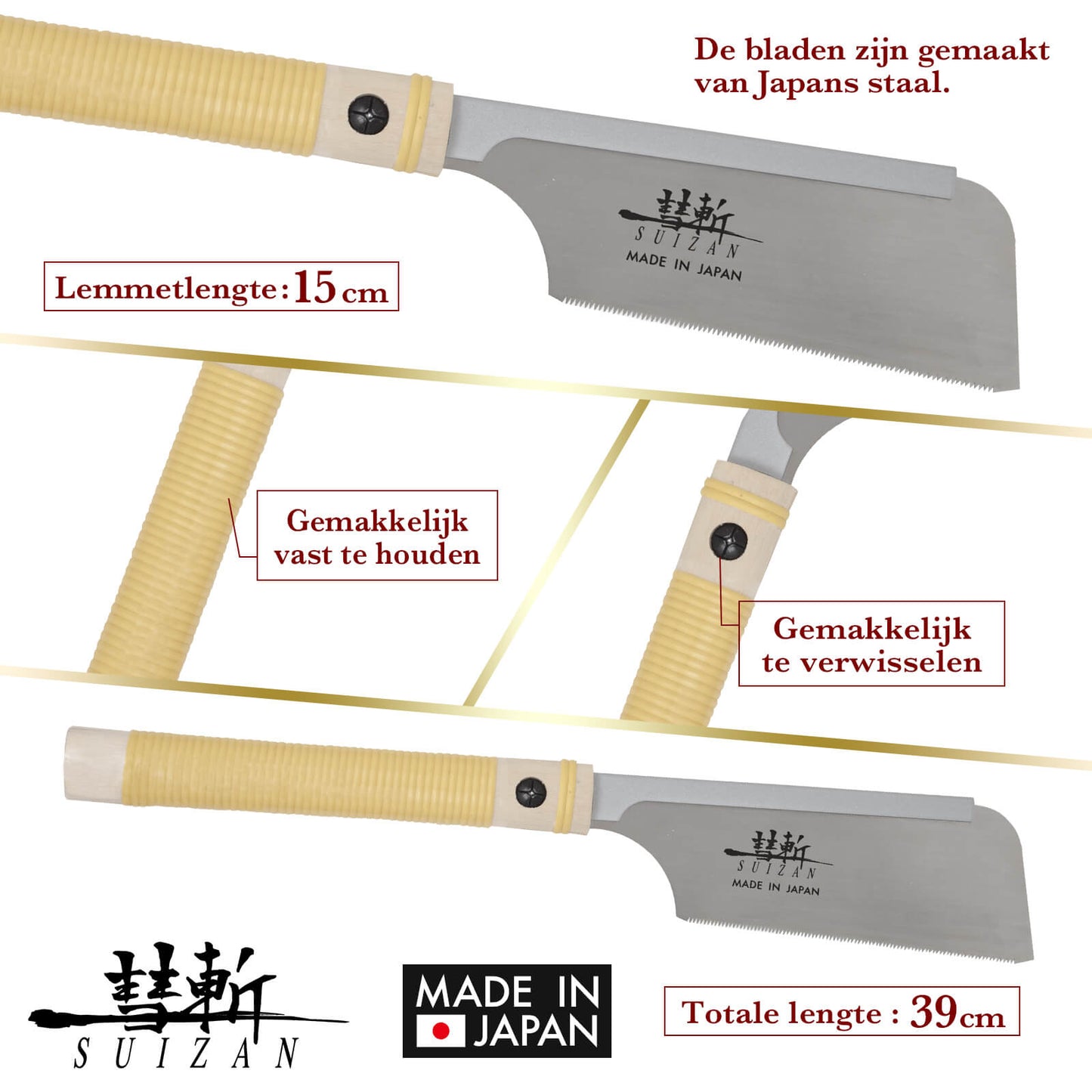 - JAPANS STAAL: Alle SUIZAN Japanse zagen bestaan uit hoogwaardig Japans staal. Het hoogwaardige staal zorgt voor vlijmscherpe sneden.