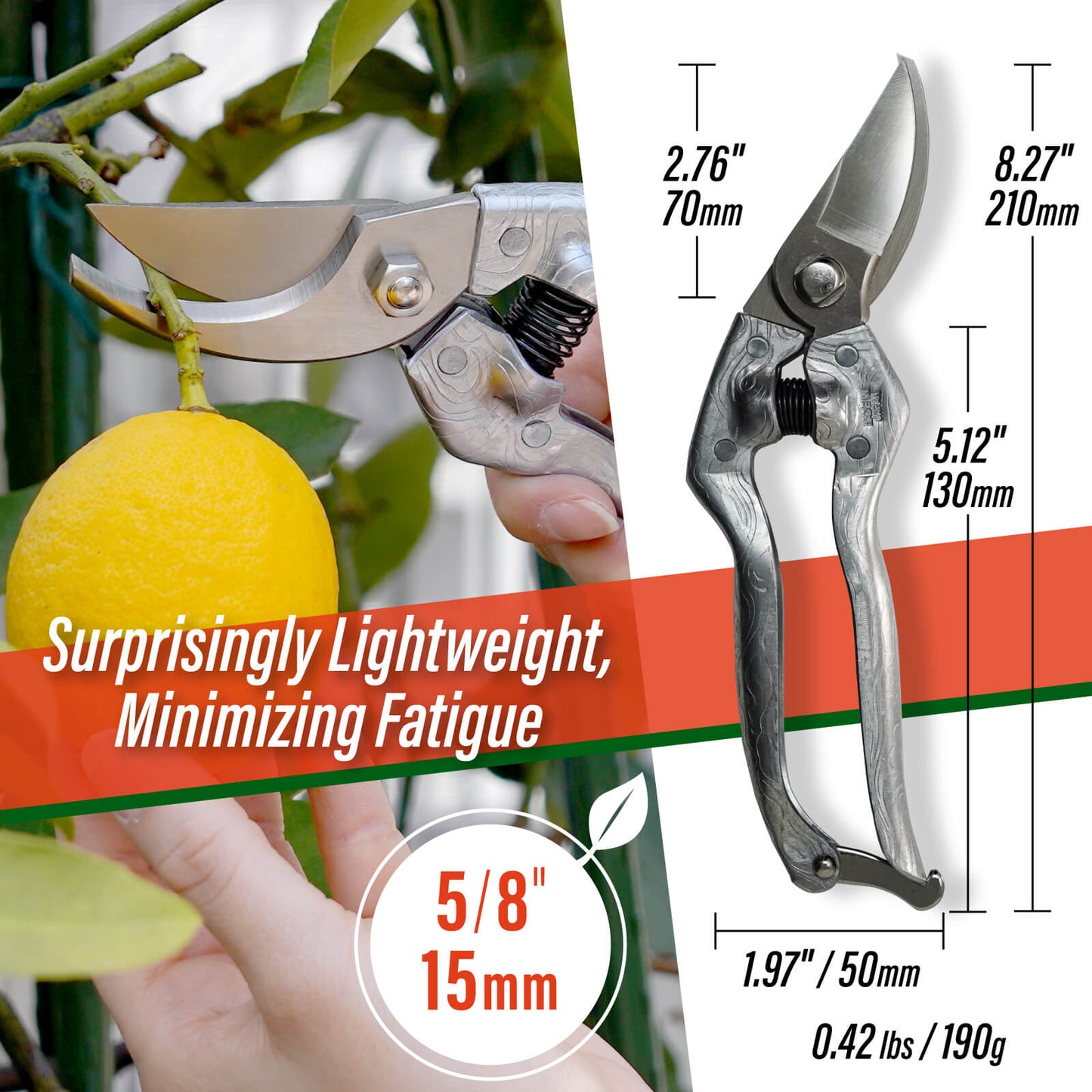 • 【Compact and Ultra Lightweight】 Weighing only 0.42 lbs (190g) and measuring 8.3 inches, these hand pruners reduce hand strain and improve efficiency during extended gardening or farming sessions.